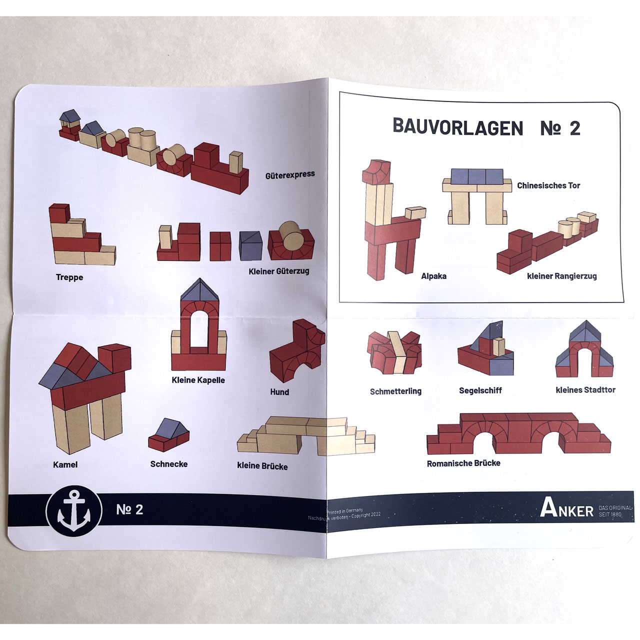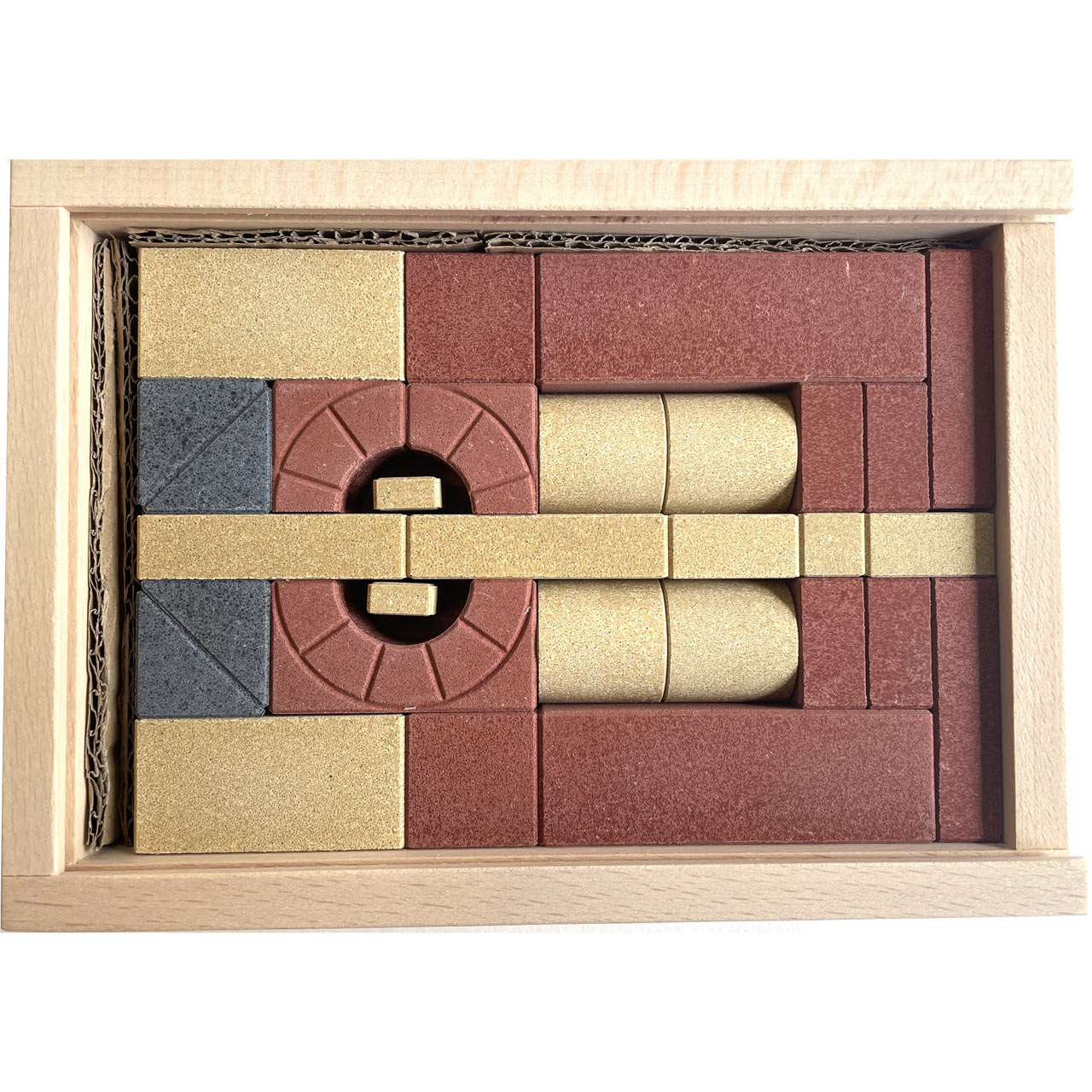 The basic starter box 2 offers the lowest cost introduction to the Anchor Stone system. It is suitable for child builders and offers suggestions that invite them to build. The wooden box contains 30 building blocks in the classic colors tan, red, and slate. Packaged in the traditional wooden box for storage with a packing diagram and building plans.